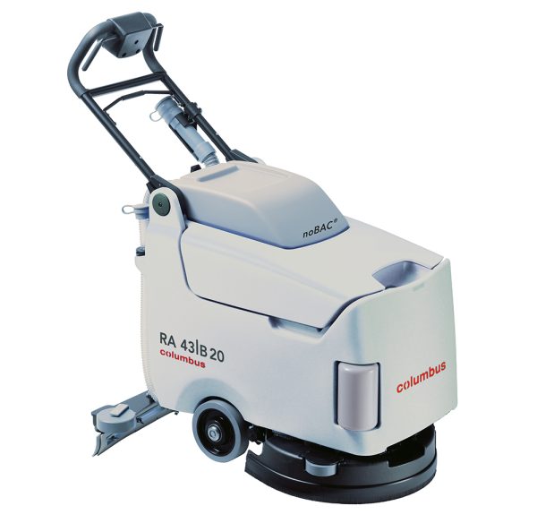 Szorowarka Columbus RA 43|B 20 iL noBAC to bateryjny automat sprzątający z wbudowanym prostownikiem, który zapewnia wygodne ładowanie maszyny z dowolnego miejsca. Zwiększona higiena dzięki antybakteryjnemu systemowi noBAC®.